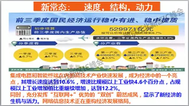 “近年来中国经济已经进入了新常态,新常态有三个最为显著的特征:我们经济发展已经实现了速度变化,结构优化和动力转化,在三个特点之下,今年前三季度国家经济保持了稳中有进的良好态势,今年前三季度第一、第二、第三国民经济速度增长保持了GDP6.7%,这个数据,是在国际经济危机下行压力没有解除、国内经济碰到诸多问题的情况下取得的,来之不易。但是如果进一步进行细分就知道,实际上6.7%是结构加快调整,经济增长方式加快转型的一个具体体现。以包括集成电路和智能终端在内的高技术产业来说,在前三季度取得了10.6%的增长。这样的增速比规模以上工业企业6%的增速要快4.6个百分点,同时高技术产业在工业增加值的比重中,已经增长到了12.2%,说明以高技术产业为代表的新经济作用逐渐增强。